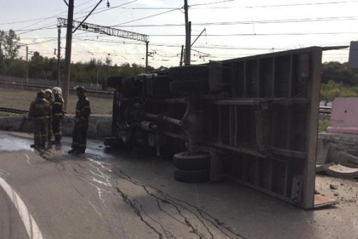 Заблокировал движение на спуске от планетария в Октябрьском районе Новосибирска перевернувшийся грузовик. Пострадавшего водителя без документов отправили в больницу.
