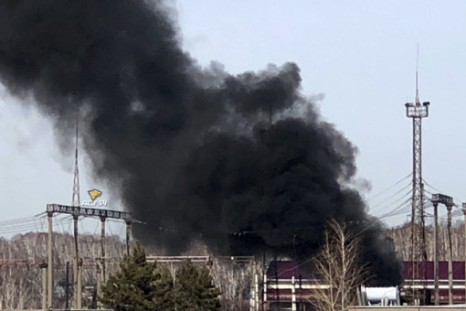 Густым черным дымом затянуло небо над Калининским районом. Возникла угроза разлива масла.