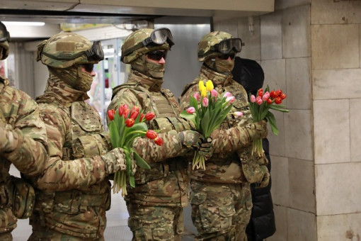 Военнослужащие Центрального военного округа (ЦВО) в преддверии Международного женского дня 8 марта поздравили представительниц прекрасного пола на центральной станции метро в Новосибирске.