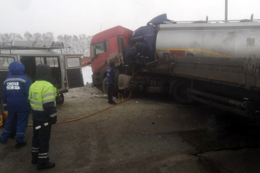 На трассе Р-256 в 17.05 произошло столкновение фуры и бензовоза с дизельным топливом. Оба водителя получили серьезные травмы.