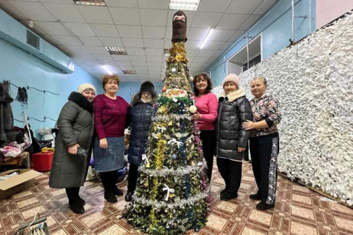 В начале мобилизации волонтеры Чановского района начали шить балаклавы и плести маскировочные сети для военнослужащих на СВО. Украшением цеха стала фронтовая елка, которую местные мастерицы собрали из подручных материалов.