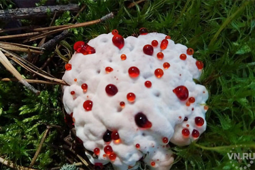 Фантастического вида гриб обнаружили грибники в одном из лесов под Новосибирском – белый бесформенный комок усеян ярко-красными капельками. Оказалось, что подобный вид не произрастает в нашей местности.