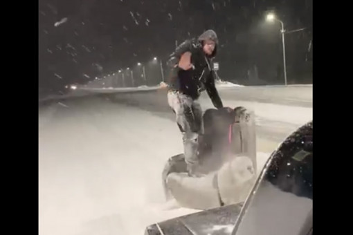 Экстремальный мужчина привязал кресло к отечественному автомобилю ВАЗ и устроил опасный заезд по снежной дороге.