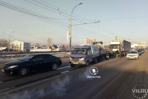 Водитель фуры спровоцировал цепную аварию на выезде с Димитровского моста в Ленинском районе: «паровозик» собрался из Renault Premium, Hino Ranger, «Газели» и Toyota Camry.