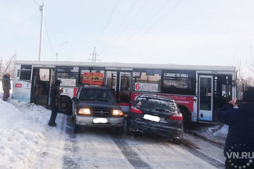 Движение транспорта полностью заблокировано на проспекте Дзержинского в Новосибирске. Автобус №6 столкнулся с двумя легковушками, и тяжелую машину развернуло поперек проезжей части.