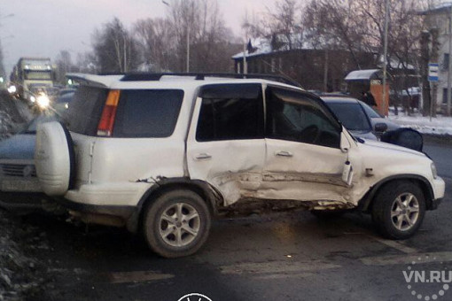 Массовая автомобильная авария произошла в Новосибирске на улице Никитина — нашли друг друга Honda CR-V, Nissan Cefiro, Renault Logan и Mitsubishi Lancer.