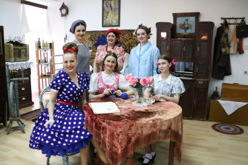 Печатные машинки, телевизоры «Рубин» и граммофоны. В честь 75-летнего юбилея артисты Сибирского народного хора воссоздали для гостей антураж советской эпохи и создают музыкальный спектакль на тему русских песен.
