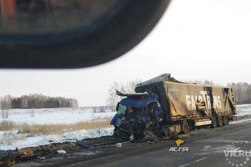 Лоб в лоб столкнулись грузовики на трассе под Барабинском Новосибирской области. Водитель Scania погиб. Один из грузовиков перевозил трубы, ими теперь усыпана дорога у места ДТП.