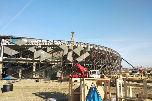 Монтаж мачт наружного освещения начался на площадке нового Ледового дворца спорта в Новосибирске. Эти конструкции будут располагаться по всей окружности комплекса. Таких мачт будет 14, высота каждой – 30 метров. Идет завоз современного вентиляционного оборудования.