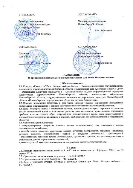1.1. Конкурс «Книга для Тёмы. История Алёны» (далее — Конкурс) проводится ГАУ НСО «Издательский дом «Советская Сибирь» (далее — Организатор Конкурса) среди детей 8–18 лет, при информационной поддержке Министерства здравоохранения Новосибирской области, Министерства образования Новосибирской области, Новосибирской государственной областной научной библиотеки.