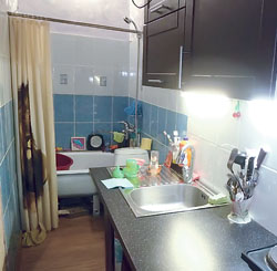 Другая участница конкурса, Надежда СИМАЧЕВА, прислала на конкурс фото своего уникального решения по экономии пространства. Девушка живет в коммуналке в Железнодорожном районе, и, чтобы не посещать места общего пользования, из маленькой подсобки, примыкающей к ее комнате, в которой ранее располагался только умывальник, она соорудила ванную, туалет и… кухню!