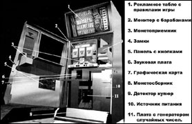 Популярность игровым салонам обеспечивают, главным образом, два вида автоматов, имеющих огромное количество разновидностей. Это колесные и видеослоты (так называемые «однорукие бандиты»), а также видеопокеры. Слоты (от английского slot - игровой автомат) - это аппараты с механическими колесами и ручкой. На колеса нанесены символы. Определенные комбинации символов и обеспечивают выигрыш. Видеослоты отличаются отсутствием механического колеса. Вместо этого здесь есть экран монитора с изображением крутящихся колес. Ну а видеопокер - это компьютерная версия стандартного покера.