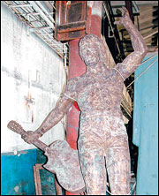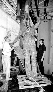 Сейчас Высоцкий, конечно, непригляден: грязно-бурый защитный слой скрывает любимые народом черты. Да вдобавок работяги заводского цеха «распяли» его на железной балке, перемотав руки и ноги поэта толстенной веревкой. Чтобы, не дай Бог, не упал. Через неделю в Новосибирск приезжает автор скульптуры, чтобы снять кислотными растворами защитный слой и натереть тело поэта воском. Со слов председателя, Высоцкий будет «гореть» — вся композиция будет медно-красного цвета. Красный Высоцкий на белом постаменте, несомненно, будет выглядеть очень ярко.
