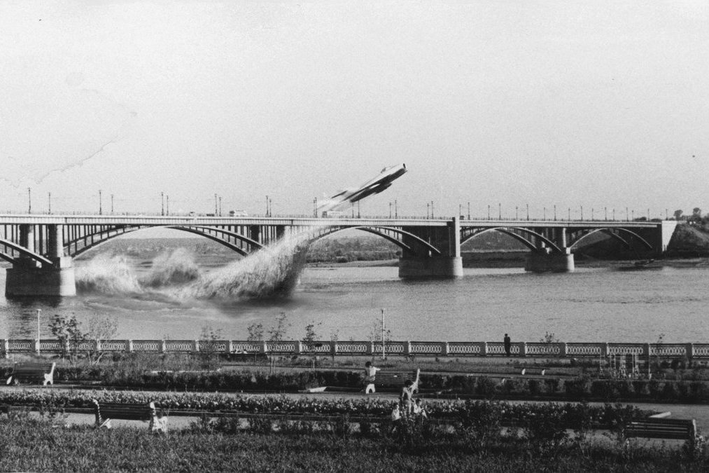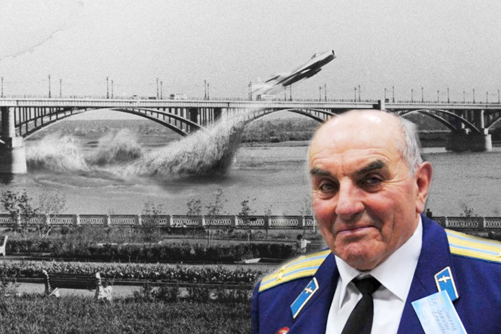 Через десять лет после сдачи Октябрьского моста в эксплуатацию — в июне 1965 года —летчик Валентин Привалов на реактивном истребителе МиГ-17 пролетел под сооружением. Эта история правдива, но окутана кучей мифов. Редкий житель столицы Сибири не видел легендарной фотографии самолета, вылетающего из-под моста. К сожалению, это коллаж, который сейчас бы назвали фотожабой, но сама история — чистая правда.