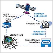 Пользователь посылает запрос через обычное модемное соединение (либо выделенную линию). Запрос доходит до регионального Интернет-провайдера и отсылается в операционный центр НТВ-Интернет, в операционном центре запрос обрабатывается и информация отправляется через спутник пользователю.