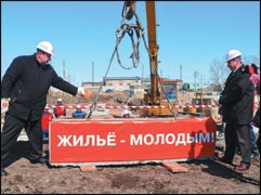Сама закладка первого камня была организована как веселый народный праздник: с песнями в исполнении фольклорного коллектива и угощением дорогих гостей. А гостей набралось немало: заместитель губернатора области Андрей Филичев и глава администрации Колыванского района Александр Панин произвели строповку первого фундаментного блока, который был уложен в котлован на месте будущего МЖК. Зрителями этого действа стали жители Колывани, представители областного управления по делам молодежи и руководство районного поселка.