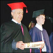 Это странно, но факт: уже свыше пяти лет нет ФМШ, а есть СУНЦ НГУ, но посвящают все-таки в фымышата! И они благоговейно целовали штандарт и с гордостью цепляли на кофты красные ФМШатские значки. Как сообщает Academ.info, около пятисот школьников прошли путь от тарелки с солью в одном краю сцены до вручения значков ФМШ в другом — мимо штандарта «Светя другим, сгораю сам», мимо посвящающего, который прикасается «жезлом науки» к плечу каждого. В самом начале посвящения жезл сломался, когда заведующий кафедрой высшей математики ММФ НГУ Михаил Фокин коснулся им плеча одного старшеклассника. Может быть, из этого маленького происшествия когда-нибудь создадут легенду, если юноша станет великим ученым? Из стен ФМШ вышло немало известных математиков и ученых…