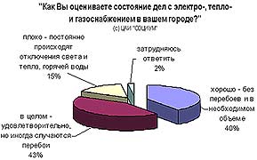 Отвечали так: 43% - удовлетворительно (перебои в подаче горячей воды, света, тепла, газа случаются, но редко), 40% - хорошо, 15% - плохо и 2% затруднились ответить.