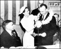 Американская девушка водружает на плечи Георгия Байдукова венок из роз. Фото сделано А 18 июня 2007 года наша страна праздновала