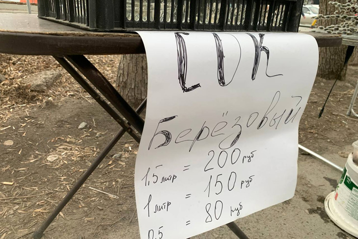 На метро «Студенческая» торговцы продают березовый сок по приемлемой цене. Полтора литра напитка стоят 200 рублей; литр – 150 рублей; пол-литра – 80 рублей.