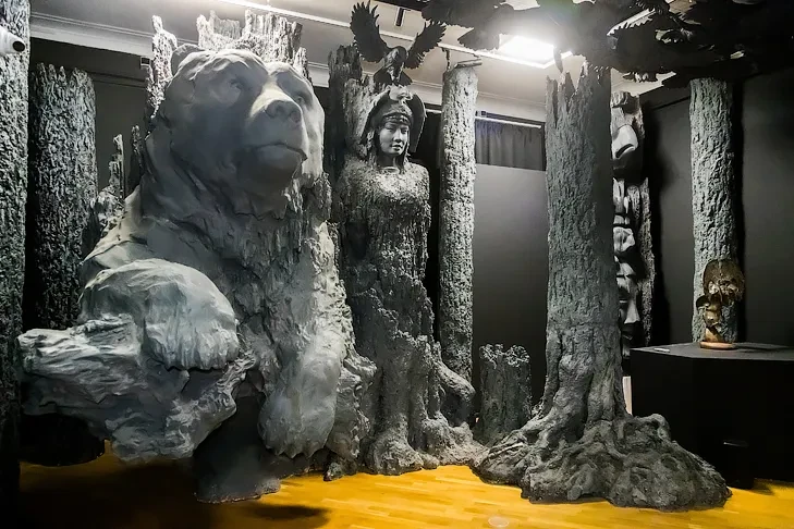 Для самой необычной археологической выставки полностью преобразили музейное пространство. В залах появились медведи и ритуальные деревья, под потолком шевелятся стаи сов, а посетителей встречает древняя жительница Сибири и человекоптицелось.