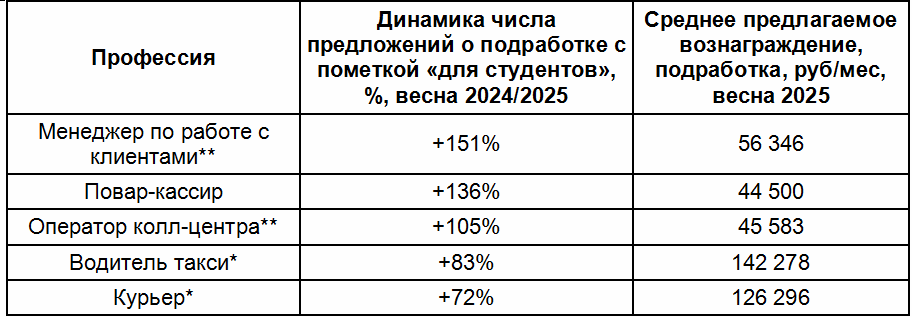 Весной этого года самыми бурно растущими направлениями подработки для студентов стали менеджеры по работе с клиентами и операторы колл-центра. Так, количество предложений для менеджеров по работе с клиентами увеличилось на 151%, а для операторов колл-центра — на 105%. Исполнителям обещают платить в среднем 56 346 руб/мес и 45 583 руб/мес соответственно.