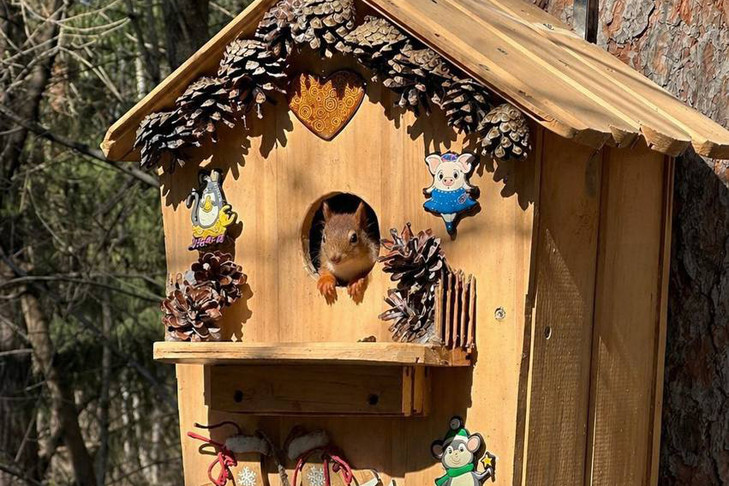 Мама-белка устроила гнездо для своих бельчат в одном из выставочных скворечников на центральной аллее Новосибирского зоопарка. Там на ограждении пустующего зимой вольера развешаны десятки скворечников, и белка выбрала лучший из них — красивый и просторный.