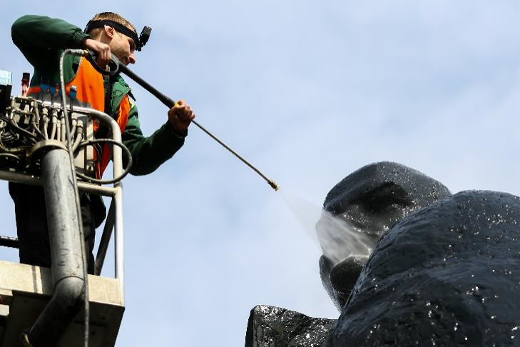 Параллельно с деревьями «водные процедуры» прошли памятник Ленину, фигуры рабочего и колхозницы, а также другие элементы скульптурных композиций центра.