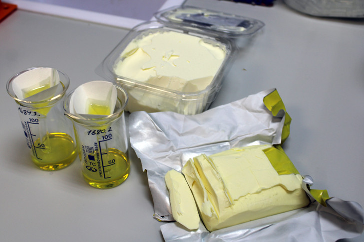 Результаты показали, что в партии брикетов несоленого сладко-сливочного масла «Крестьянское» с массовой долей жира 72,5% из Новосибирской области массовая доля метилового эфира линолевой кислоты (С 18:2) составляет 5,5% при норме, установленной ГОСТом, 2,2-5,5%; масляной кислоты (C 4:0) – 2,3% при норме 2,4-4,2%; олеиновой кислоты (С18:1) – 33,0% при норме 20-32%; прочих жирных кислот – 2% при норме 4-6,5%. Также в образце обнаружены фитостерины – вещества, которые содержатся только в растительных жирах.