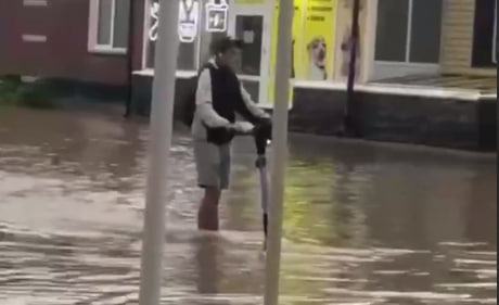 Обилие осадков нисколько не смущает поклонников самокатов. По соцсетям расходится видео, опубликованное в ТГ-канале «Раньше всех», на котором молодой человек едет на самокате сквозь приличный поток воды.