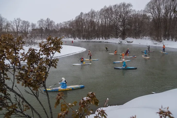 Сап-серферам не помешал даже мороз – 27 декабря столбик термометра показывал -20 градусов, однако это не стало преградой для отчаянных любителей рассекать по водной глади. Местом проведения новогодней акции уже несколько лет становится незамерзающая протока неподалеку от Новомарусино.