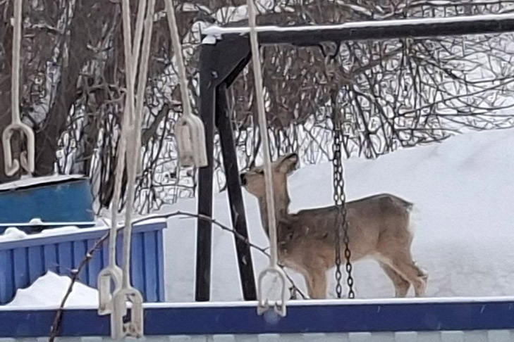 К дому жителей улицы Линейной в Тогучине подошла косуля. Судя по всему, дикое животное вышло из леса в поисках пищи.
