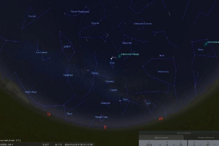 Ежегодный метеорный поток Лириды, активный с 14 по 30 апреля, достиг своего пика в ночь с 22 на 23 апреля. По данным Большого Новосибирского планетария, в этот период можно было наблюдать до 20 «падающих звезд» в час. Радиант потока, созвездие Лиры, с яркой звездой Вегой, поднималось в небе после 21:00, а к трем часам ночи заняло удобное высокое положение на юго-востоке.
