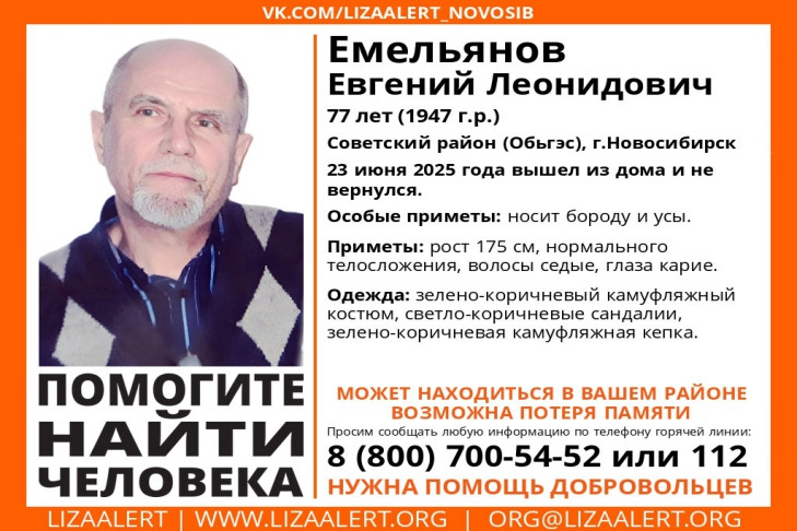77-летнего Евгения Емельянова уже несколько часов ищут на ОбьГЭСе в Новосибирске. Седовласый пожилой человек с карими глазами, полностью одетый в камуфляж, носит бороду и усы. Сообщение о пропаже новосибирца появилось 6 часов назад.