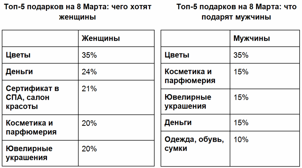 ● Мужчины считают, что хороший подарок к 8 Марта стоит около 6 тысяч рублей. Однако, по мнению женщин, эта сумма составляет 6,5 тысячи рублей.