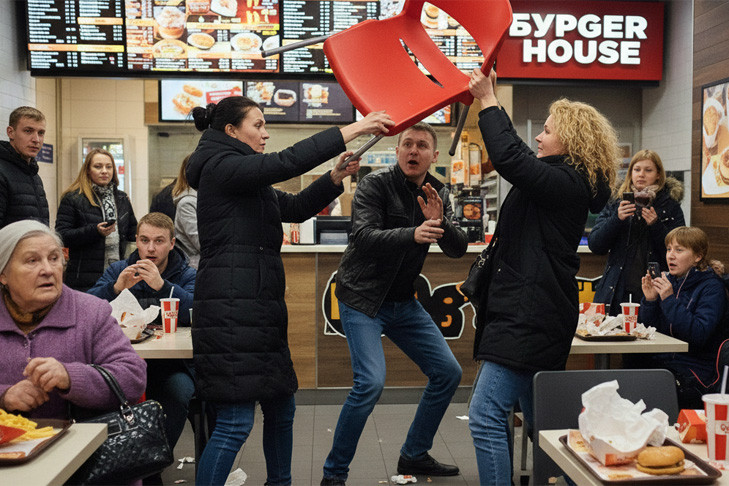 По данным сотрудников охраны, конфликт начался, когда две женщины примерно по 30 лет попытались заговорить с проходившим мимо мужчиной. Получив отказ, они перешли к агрессии: по очереди бросали в него стулья. Мужчине удалось уйти без серьёзных травм. Пострадал интерьер: гипсокартонный козырёк над кассой получил значительные повреждения от попадания стула.