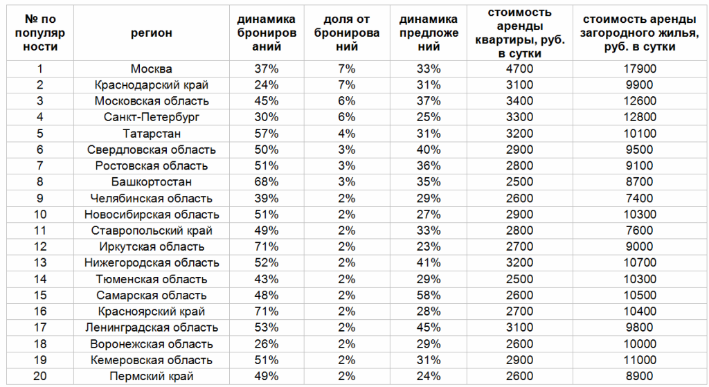 Дешевле всего снять квартиру среди регионов из топ-20 по популярности в марте 2025 года стоило в Тюменской области и Башкортостане (2500 рублей за сутки в обоих), Пермском крае, Челябинской, Воронежской и Самарской областях (по 2600 рублей в каждом). Самые высокие цены были зафиксированы в Москве (4700 рублей, Московской области (3400 рублей), Санкт-Петербурге (3300 рублей), Нижегородской области и Татарстане (по 3200 рублей).
