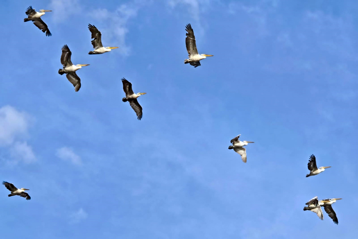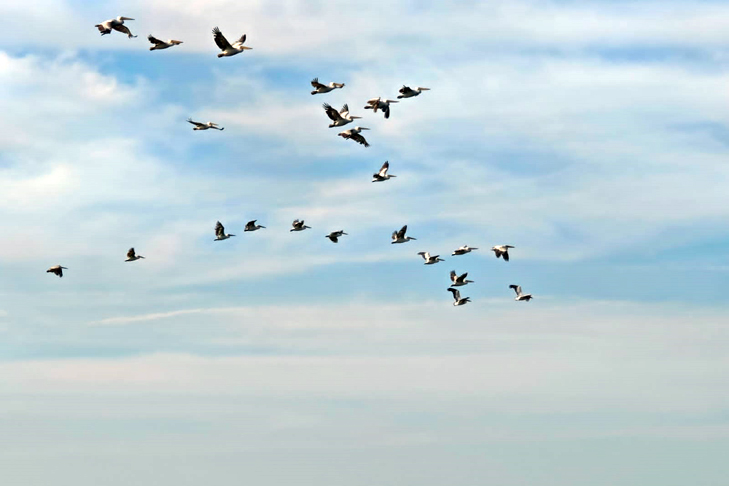 «Зимуют кудрявые пеликаны тоже в более северных регионах, чем розовые, а именно на Каспии вблизи линии сплошного ледового покрова. Так что людям порой в особо суровые зимы приходится помогать этим птицам, ломая лед и предлагая рыбу», — говорит известный новосибирский орнитолог Алексей Яновский.
