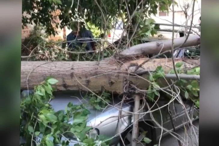 Тополь неаккуратно приземлился на капот иномарки. Скриншот с записи АСТ-54