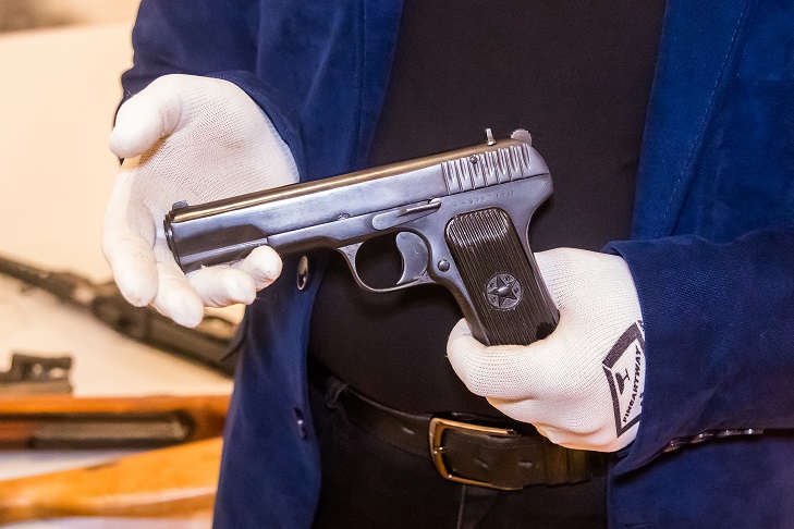 Еще один знаковый и до боли знакомый пистолет на музейной выставке – легендарный «Тульский Токарев». Именно пистолет ТТ все видели в руках у политрука на легендарной фотографии Макса Альперта времен Великой Отечественной. Памятник политруку с пистолетом ТТ в руках установлен на трассе Луганск-Бахмут.
