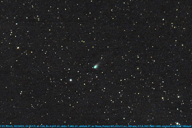 «Видимость кометы довольно плохая, ее сейчас видно по вечерам на высоте не более 5 градусов, по утрам немного получше – она поднимается примерно до 10 градусов, – пояснил Михаил Маслов. – Я ее сфотографировал около 4 утра 21 апреля на высоте около 8 градусов, этому помогло чистое ясное небо, без дымки, потому что дымка сильно ухудшает видимость прежде всего у горизонта».