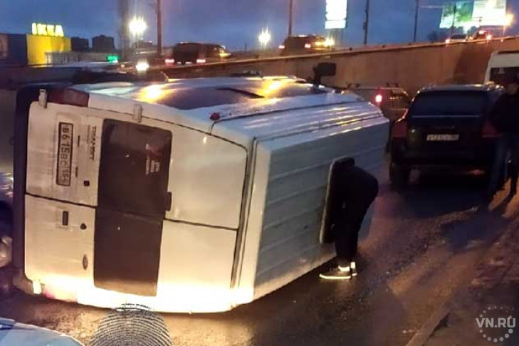 Очевидцы уточняют, что микроавтобус лежит перед подземным заездом в ТЦ «Мега».