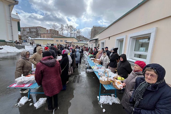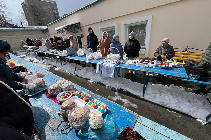 Несмотря на холод и сильный ветер сотни верующих жителей Новосибирска готовятся встретить великий праздник Пасхи. На площади Вознесенского собора собрались несколько сотен человек. Как передает корреспондент VN.ru с места событий, горожане заняли все подготовленные столы.