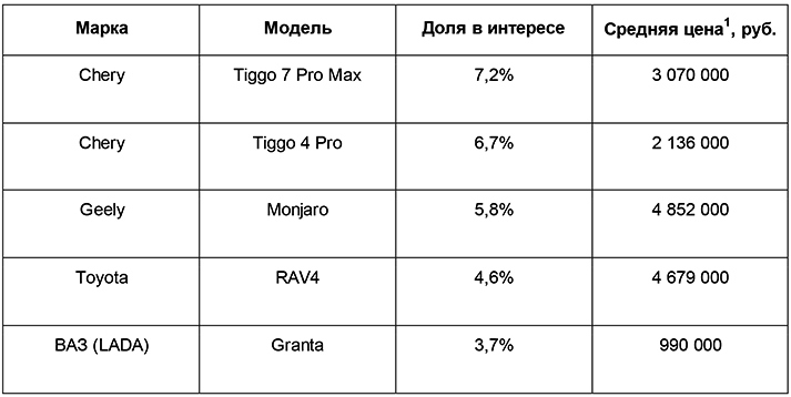 Среди моделей по доле в интересе пользователей платформы лидирует Chery Tiggo 7 Pro Max с показателем 7,2%. На втором месте – еще одна модель этого же бренда – Tiggo 4 Pro (6,7%). Третью строчку занимает Geely Monjaro (5,8%), четвертую – Toyota RAV4 (4,6%). Замыкает топ-5 ВАЗ (LADA) Granta (3,7%). Лидером по динамике интереса за год среди топ-5 стал Chery Tiggo 4 Pro.