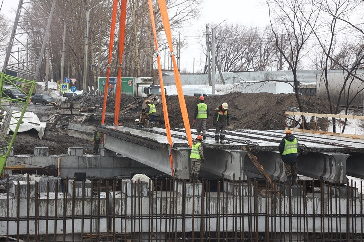 На сегодня подрядчик выполняет работы ключевого этапа – монтаж балок пролетных строений: на пролетном строении 2-3 смонтировали 11 балок из 14, на пролетном строении 1-2 смонтировали 4 балки из 14.