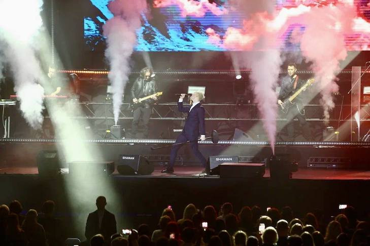 Пока Шаман менял сценический образ за кулисами, на сцене зрителей развлекала ростовая кукла медведь в русской рубахе, а сам Шаман продемонстрировал элементы этнического шоу: горловое пение «под язык», танец с саблей и игру на балалайке. Шоу сочетало песни с монологами и стендап‑вставками: артист отвечал на вопросы из интернета и прямо обращался к хейтерам, заявив, что даже недоброжелателей любит, поскольку они делают его сильнее. Одной из визуальных тем вечера стали кожаные штаны — Шаман объяснил, что это его фирменный образ и «они шикарно сидят». Также он в шутку пояснил, почему иногда засовывает микрофон в штаны: так ему удобнее аплодировать зрителям.