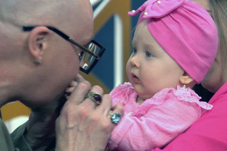 Однако появившаяся в студии такая же как он голубоглазая девочка 9 месяцев от роду на руках у матери Альбины не оставила его равнодушным. Шура просто подскочил, желая ближе пообщаться с родственницами, и пообещал, что теперь обязательно будет поддерживать общение.