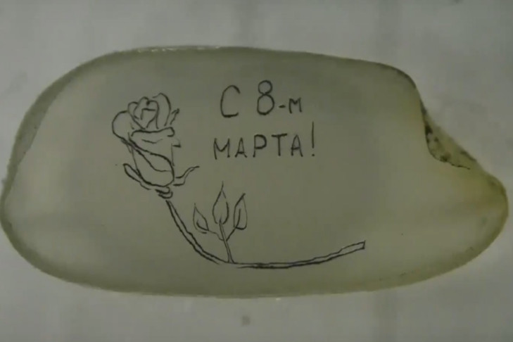 На видео Владимир Анискин процарапал изображение на зернышке, потом нанес краску. После того, как краску смыли, открытка на рисинке проявилась: поздравление с 8-м Марта мастер украсил розой.