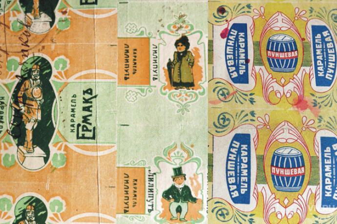 Этикетки карамели обнаружились на обороте продуктовых карточек, выдаваемых красноармейцам в 1920 году. Они напечатаны в Москве, но, скорее всего, имеют сибирскую историю, поскольку и цветной печати в городе тогда не было, и обнаружены в нашем областном архиве. С бумагой тогда было худо, вот и печатали на обороте оберточного полукартона.