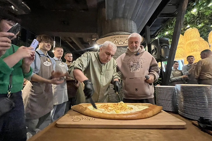 Сосо Павлиашвили лично разрезал хачапури и раздал порции горячего блюда всем присутствующим. Собравшиеся гости долго не отпускали певца, делая совместные фото.